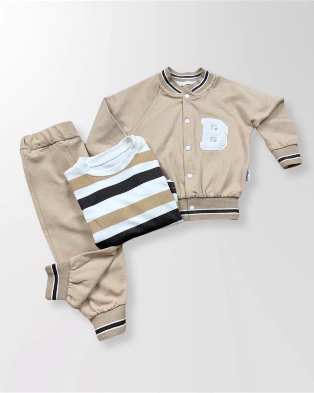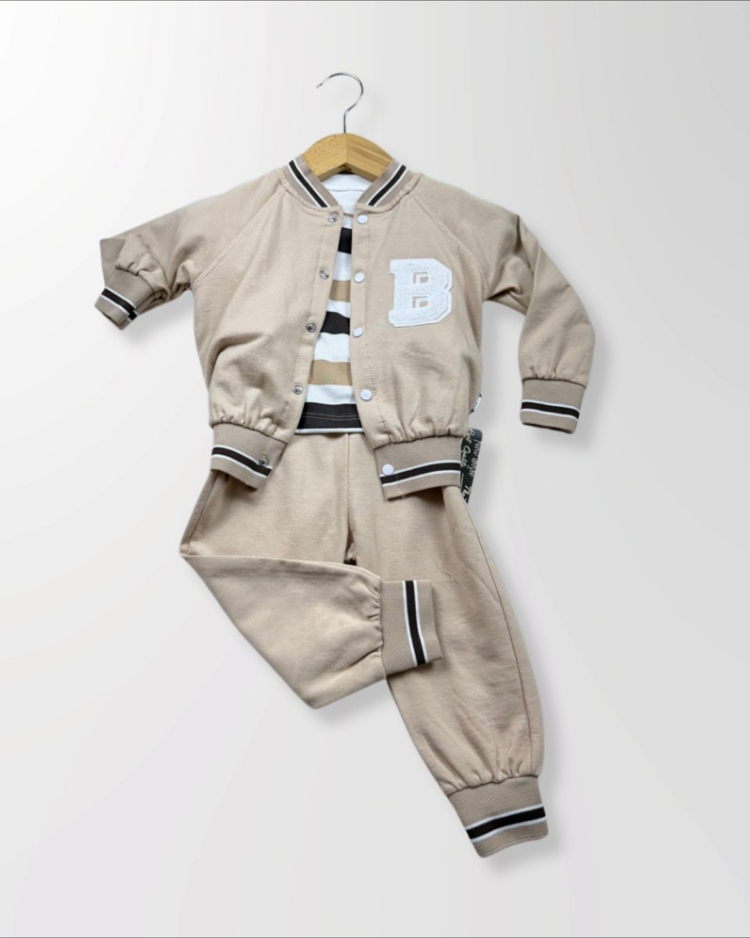 Kolej tarzı 3’lü bebek takımı. Yumuşak dokulu, rahat kalıp ve şık “B” detaylı. Günlük kombinler için hem konforlu hem stil sahibi bir tercih.