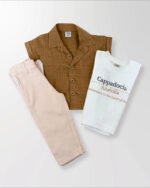 Doğal tonların şıklığını yansıtan Cappadocia 3’lü takım; keten dokulu gömlek, baskılı tişört ve rahat kesim pantolonuyla minik beylerin günlük ve özel kombinleri için ideal bir seçenektir.