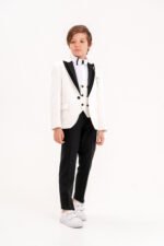 Crown Erkek Çocuk Damatlık Takım Elbise– Yelekli Papyonlu Şık Özel Gün ve Düğün Kombini-Beyaz