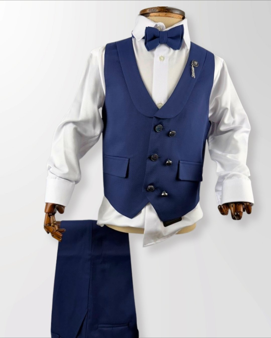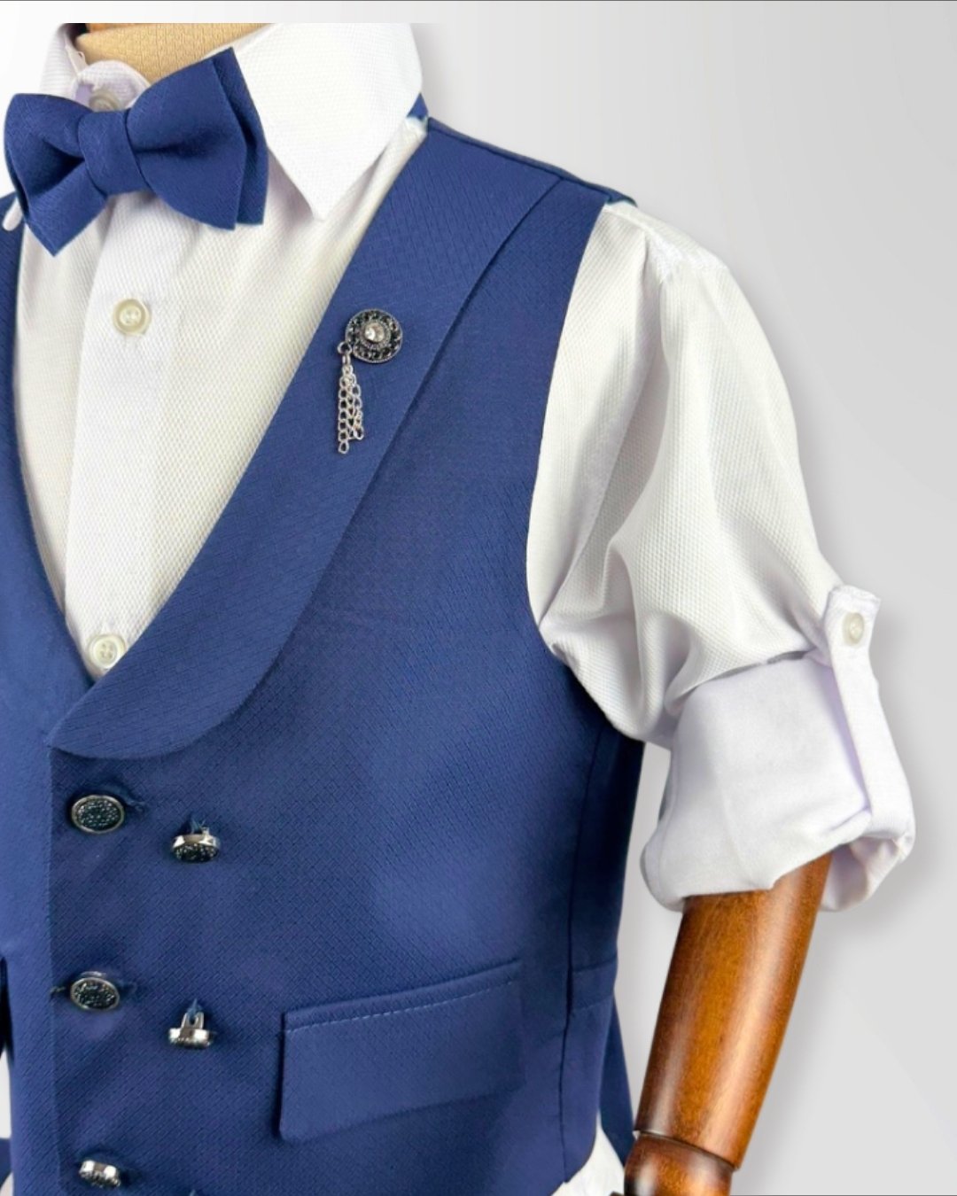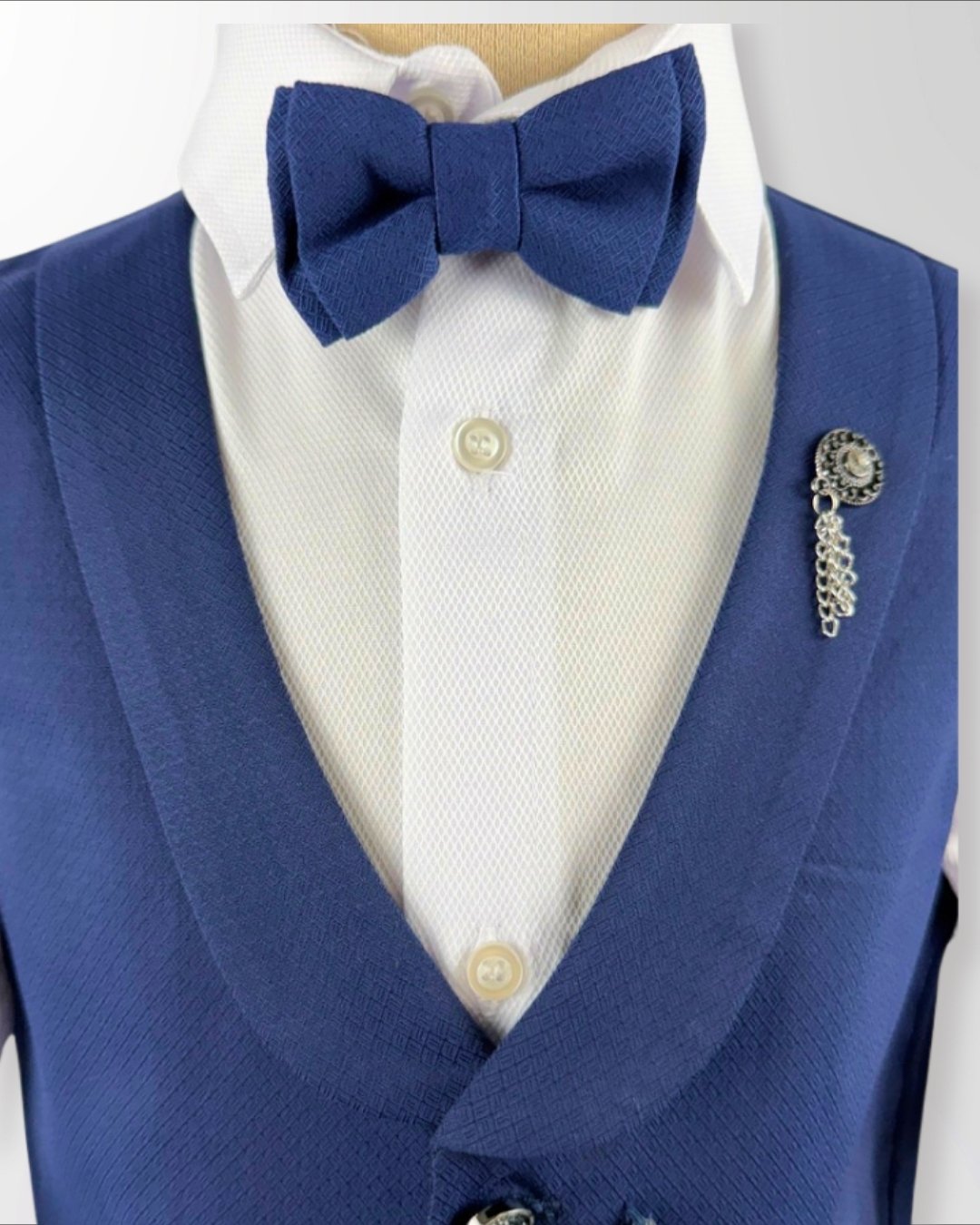 Minik beylerin en özel anlarında zarif ve etkileyici bir görünüm kazanması için tasarlanan bu yelekli takım, klasik şıklığı modern çizgilerle buluşturur. Özel dokulu yeleği, papyonu ve şık gömleği ile tam bir tören stili sunar.