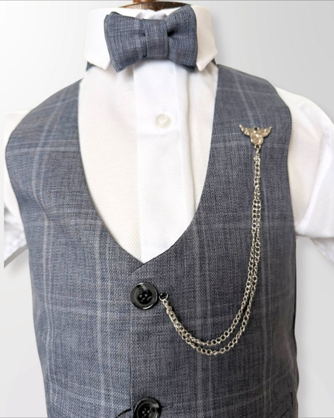Yelek üzerindeki zincir aksesuar detayı ve papyon uyumu takıma sofistike bir hava katar.