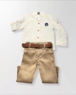 Şıklığı ve rahatlığı bir araya getiren Leo  Hakim Yaka Takım, minik beylerin özel gün kombinleri için tasarlandı. Modern hakim yaka gömleği ve kemer detaylı pantolonu ile hem bayramlarda hem doğum günlerinde hem de davetlerde zarif bir görünüm sunar.