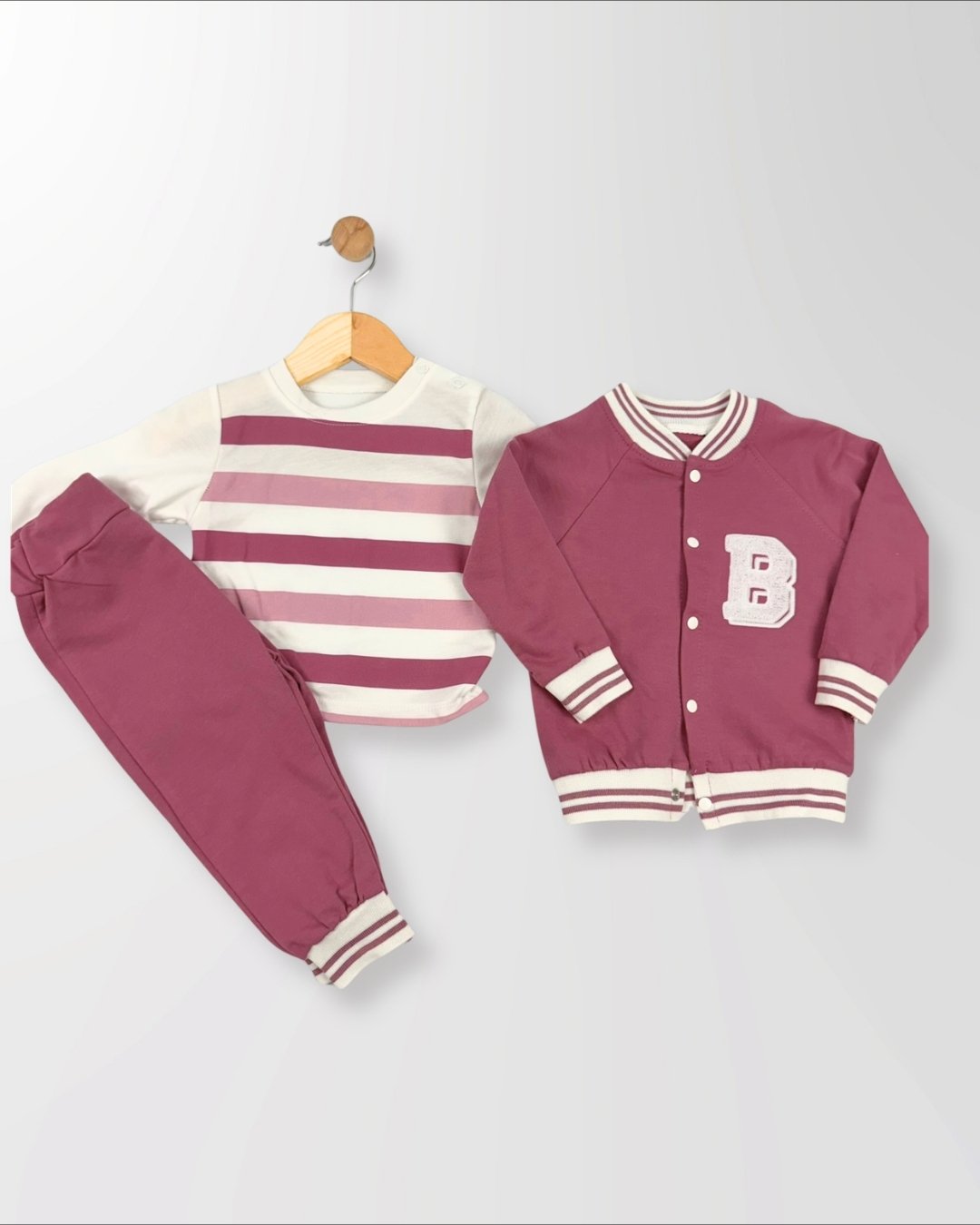 Kolej tarzı 3’lü bebek takımı. Yumuşak dokulu, rahat kalıp ve şık “B” detaylı. Günlük kombinler için hem konforlu hem stil sahibi bir tercih.