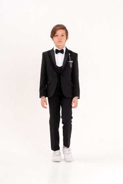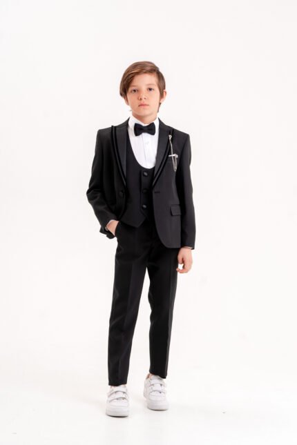 Crown Erkek Çocuk Damatlık Takım Elbise– Yelekli Papyonlu Şık Özel Gün ve Düğün Kombini-Siyah